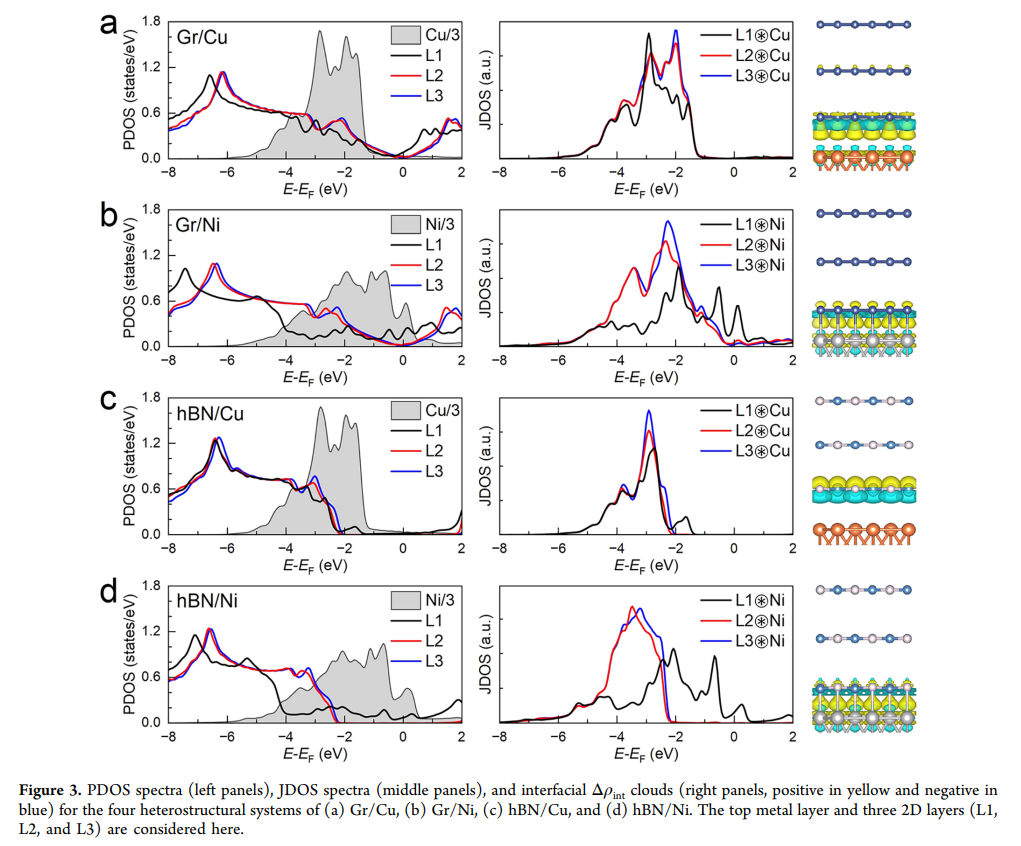 研究团队通过对 4 种典型异质结构(Gr/Cu、Gr/Ni、hBN/Cu、hBN/Ni)的第一性原理计算,推翻了静态机制的主导地位,提出了动态电动势机制,关键发现如下: