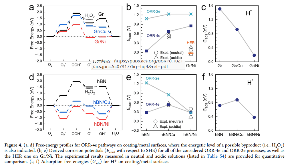 例:hBN 与 Ni 的界面共价键更强,O₂吸附能比石墨烯体系低 1.5 eV,导致 ORR 更易启动,因此 hBN/Ni 体系的腐蚀电流密度更高。