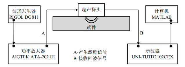 实验过程:发生器产生脉冲持续时间1μs、频率1MHz、峰值电压10V的正弦脉冲信号,经放大器放大10倍至100V以驱动换能器;换能器通过逆压电效应产生超声波,经耦合剂传入试件,底面反射后的回波由换能器接收并转为电信号,接收线束串接前端放大电路降噪提敏,再经示波器(200MHz采样、16次平均采样,单点采样间隔5ns)传输至计算机,生成超声回波波群时域信号。