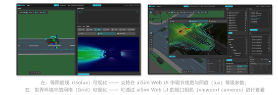 aiSim 6 进一步完善了车辆灯光系统的物理仿真能力,覆盖大灯、尾灯、转向灯等全系灯组,支持 Isolux 照度线可视化与网格化光照分布分析。核心应用场景是夜间 ADAS 功能验证,包括必须在物理级夜间光照模型下才能进行有效的合规性验证的远光辅助(High-Beam Assist)和自适应矩阵大灯功能。