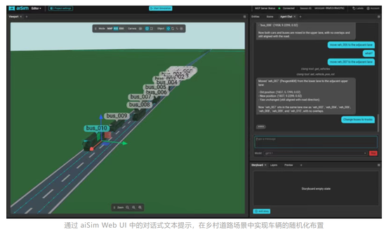 aiSim 6 通过集成 Model Context Protocol(MCP),将主流 AI 大模型(Gemini、ChatGPT、Copilot 等)直接接入仿真编辑器工作流。工程师可以通过自然语言 prompt 描述测试意图——例如"在四路交叉口随机放置 8 辆车,包含 2 辆大型货车"——系统自动生成符合 OpenSCENARIO 标准的场景文件。