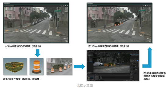 3D Gaussian Splatting(3DGS)是当前神经场景重建的主流技术路线,能够将真实道路环境重建为高保真数字孪生场景,仿真效果极具说服力。