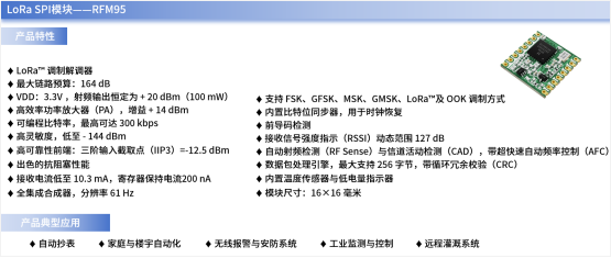 例如,RFM95收发器就是一款由华普微自主开发的、支持LoRa调制技术的远程通信模块。
