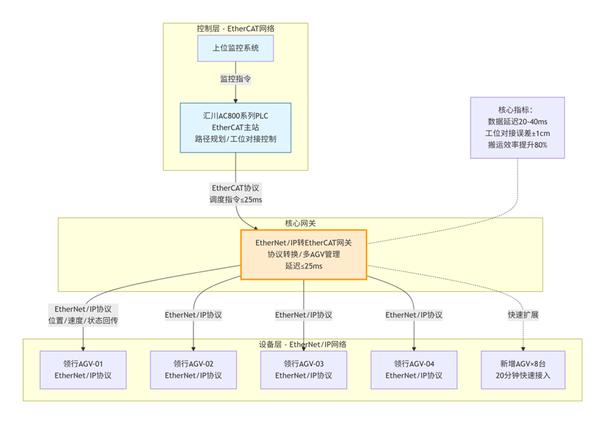 某电商智能仓储中心升级AGV搬运产线,核心调度采用领行EtherNet/IP协议AGV机器人,负责仓储货物自动化搬运、货架对接;现场控制层部署汇川AC800系列EtherCAT协议PLC,承担AGV行走路径规划、工位对接、输送线联动控制。因AGV与PLC协议不兼容,原有人工调度AGV的方式效率低,工位对接误差大,且无法实现AGV状态与PLC控制指令的实时交互,导致仓储分拣效率低,无法满足日均10万单的分拣需求。企业核心要求:实现EtherNet/IP与EtherCAT跨协议实时通讯,AGV位置、运行状态等数据回传延迟≤50ms,PLC调度指令下发延迟≤30ms,适配仓储多AGV并发作业环境,支持后期AGV数量无缝扩展。
