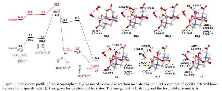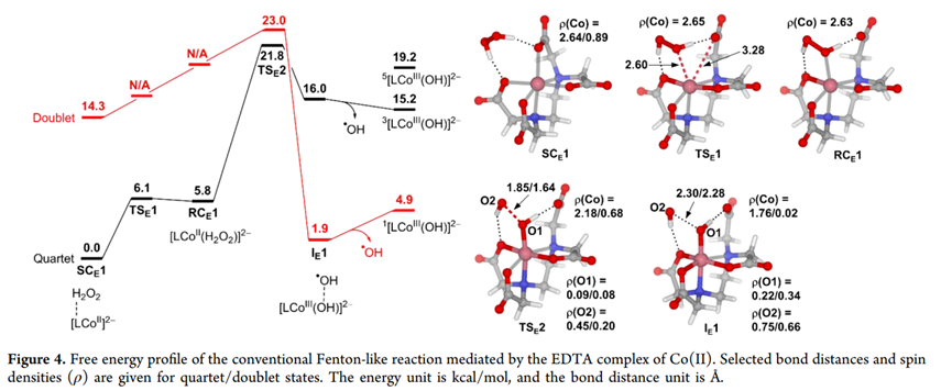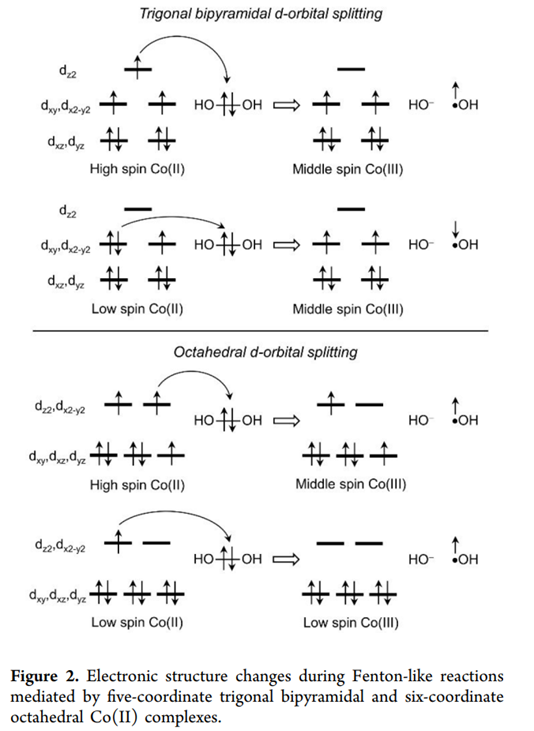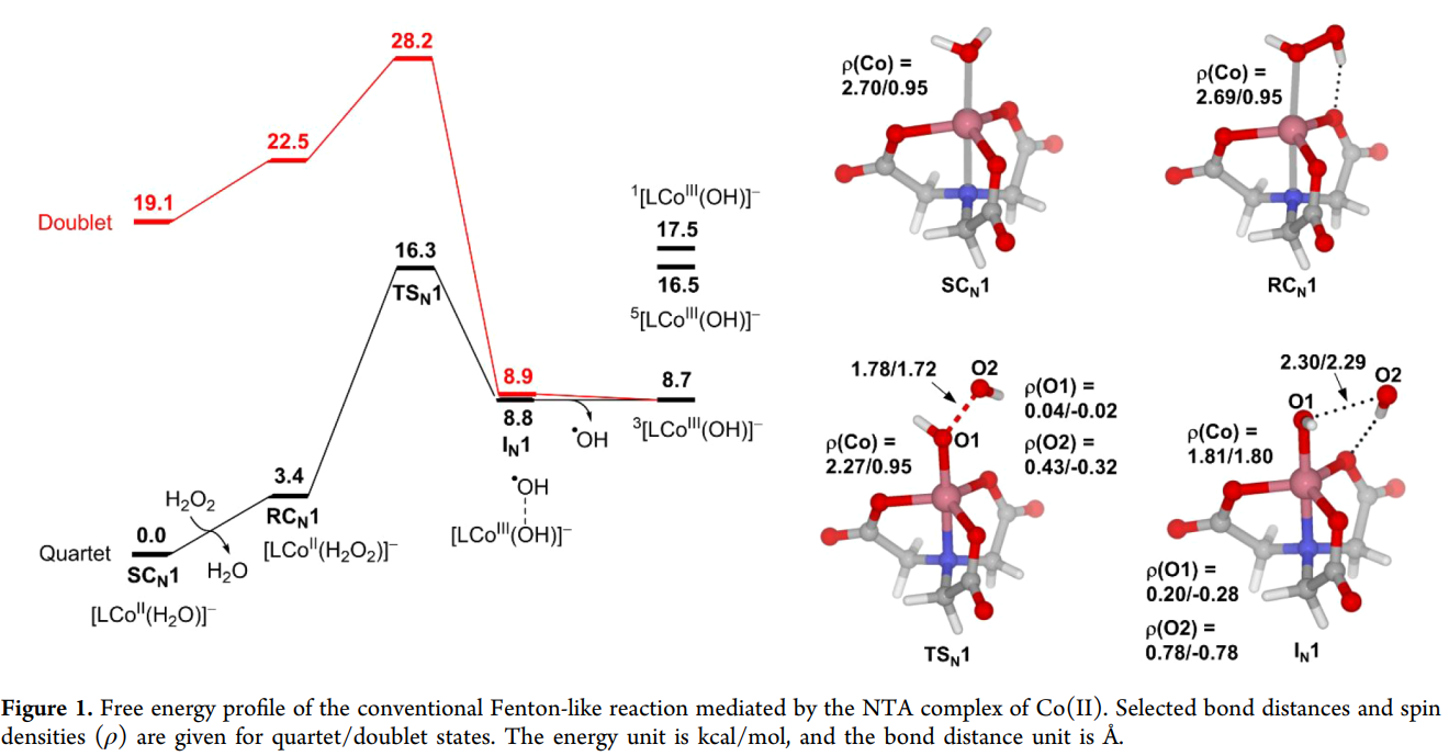 芬顿(Fenton)反应作为高级氧化技术(AOPs)的核心,在环境修复、生物代谢及工业催化领域扮演着至关重要的角色。传统芬顿反应依赖铁盐与过氧化氢(H2O2)产生高活性的羟基自由基(OH),但其对 pH 值的严苛要求限制了实际应用。作为铁的同族元素,钴(Co)配合物展现出更宽的 pH 适用范围和独特的催化活性。然而,钴基类芬顿反应中活性氧的产生机制是生成游离的 OH,还是形成高价钴氧物种(Co(IV)=O)长期以来存在争议。本文章通过详细的理论计算,揭示了配体环境如何决定钴催化剂的行为模式,为新型高效催化剂的设计提供了理论支点。