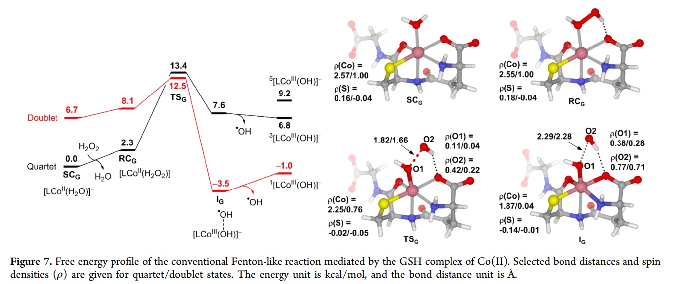 该工作通过系统 DFT 计算,首次区分并量化了 Co(II)-Fenton-like 体系中第一与第二配位对反应路径的本质影响。计算结果表明,传统 O–O 均裂路径在 Co(II) 体系中并非主导,而第二配位球 H₂O₂ 可通过后续放热的 HAT 过程重塑整体自由能面,从而解释 •OOH 为主 ROS 的实验现象。相比之下,thiolate 配位通过直接调控金属中心电子结构,使经典 •OH 生成路径重新变得可行。