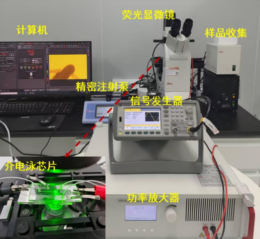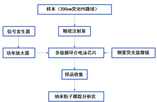 实验过程:实验系统由信号发生器、高压功率放大器(Aigtek,ATA-4315)、精密注射泵、倒置荧光显微镜及纳米粒子跟踪分析仪构成,样本为荧光聚苯乙烯微球与超纯水的混合液;实验时先将微球悬浮液超声分散并稀释后,再由注射泵恒速注入芯片,信号发生器施加1MHz、2Vpp正弦交流电并经ATA-4315高压功率放大器调幅,通过显微镜实时观测微球轨迹,收集循环分选的样本,用纳米粒子跟踪分析仪进行粒径分布表征。
