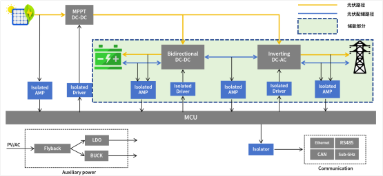 如下电气隔离方案示意图所示,在光储一体化、并网储能等实际应用架构中,MCU是低压测控侧的核心处理单元,通常工作在3V左右的安全电平中,其必须严格隔离来自高压回路的干扰与冲击。