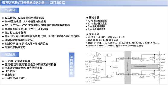 CMT8602X是一系列增强型的隔离式双通道栅极驱动器,其4A的峰值拉电流和6A的峰值灌电流不仅可驱动高达5MHz的功率晶体管,还具有一流的传播延迟和脉宽失真度;CMT8602X的输入侧通过一个5700V rms增强型隔离层与两个输出驱动器隔离,共模瞬态抗扰度(CMTI)的最小值为150 kV/μs。两个二次侧驱动器之间采用内部功能隔离,可支持高达1500VDC的工作电压。