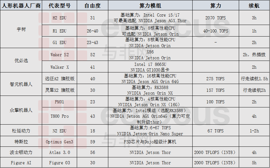 无论中国还是海外人形机器人厂商,其核心人形机器人产品的算力模组大多采用NVIDIA的Jetson产品,如宇树科技的G1/R1/H2,优必选的Walker S2,Figure Ai的Figure 03等。