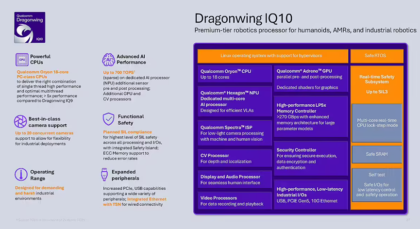 旗舰型号Dragonwing IQ10系列于CES 2026发布,直接对标英伟达Jetson Thor,被称作“人形机器人大脑”。该芯片最高达700 TOPS AI性能且针对VLA大模型优化,搭载18核自研Oryon CPU,支持20路以上摄像头并行接入,安全岛达SIL-3级功能安全标准,目前已被Figure集成至其通用机器人架构中。高通IQ10采用4nm先进制程工艺。该制程为其18核Oryon CPU、Hexagon NPU与Adreno GPU提供了坚实的能效基础,在实现700 TOPS AI算力的同时,相比前代功耗降低约40%,并能在-40℃~115℃的工业宽温环境下稳定运行。