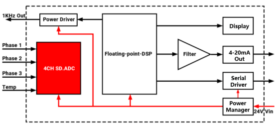 核心数据采集:调理后的模拟信号送入 4 通道 Sigma-Delta ADC(4CH SD.ADC),完成相位、温度信号的高精度模数转换,为流量解算提供可靠数字信号。