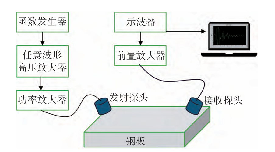 测试设备:硬件设备:函数发生器、任意波形高压放大器、功率放大器、空气耦合发射/接收探头(直径28mm,中心频率200kHz)、Q235钢板试件(200mm×400mm)、前置放大器、示波器。
