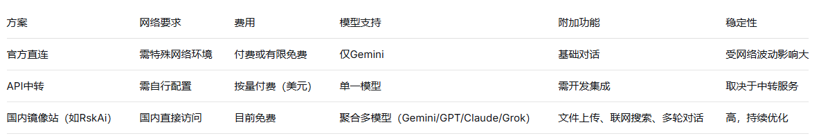二、国内用户访问Gemini的常见方案对比
