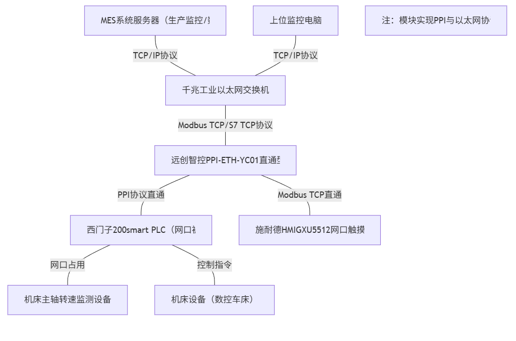 1. 硬件配置:核心硬件包括西门子200smart PLC(CPU SR40,网口被占用,带PPI 9针DP口)、施耐德HMIGXU5512网口触摸屏、远创智控PPI-ETH-YC01直通型以太网模块、千兆工业以太网交换机、MES系统服务器(搭载生产监控与数据追溯系统)、上位监控电脑、机床设备(数控车床)、主轴转速监测设备、专用通讯线缆(PPI通讯线、网线)。