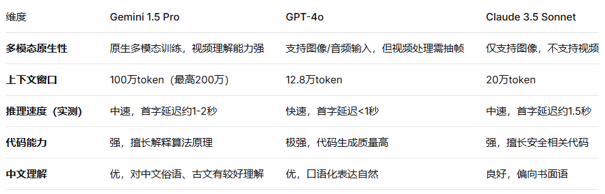为帮助读者更直观理解Gemini的技术定位,我们将三款顶级模型进行横向对比: