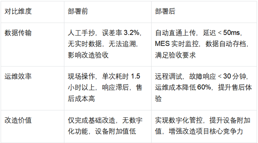 运维效率低下,成本偏高:PLC程序调试、故障排查需工程师到现场,通过专用MPI电缆连接设备操作,单次运维耗时5小时以上,每月运维成本约4000元,无法实现远程快速响应,设备故障易造成生产线停机,影响改造后设备的正常交付与使用,难以满足非标改造项目的售后运维要求。