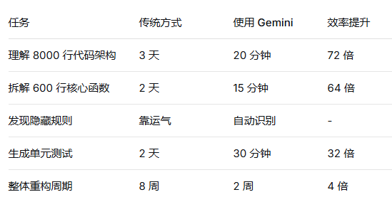 八年的“屎山”代码,曾经是团队无人敢碰的禁区。而 Gemini 3 Pro 让我在两周内完成了从理解到重构的全过程,避免了两个月的手工苦力。