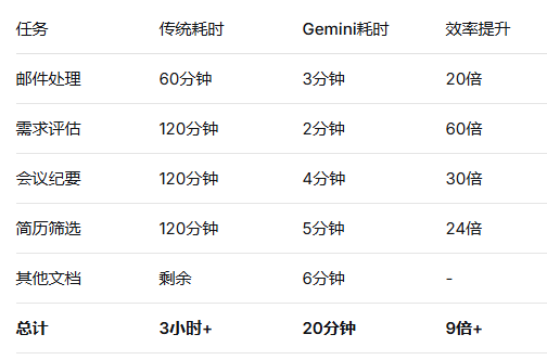 Gemini能理解“谁发的邮件”比“什么时候发的”更重要,“老板的待办”比“同事的知会”更紧急。这不是简单的规则匹配,而是对组织关系和业务上下文的理解。
