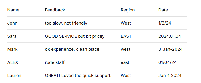 我们来看一个真实案例:某公司收集的5条客户反馈数据,原始表格长这样