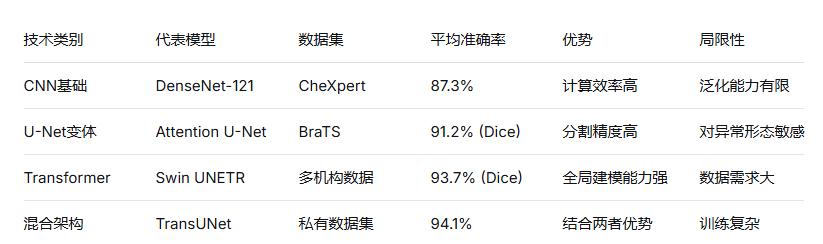 对每个类别,标注研究方法(CNN/Transformer/U-Net等)、数据集、核心结论