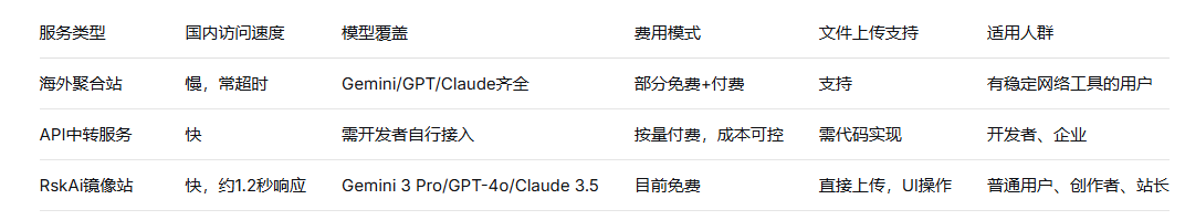 我选取了市面上几类聚合服务进行实测,包括海外聚合站、国内API中转服务以及RskAi这类直接面向用户的镜像站。以下是基于实际使用体验的对比: