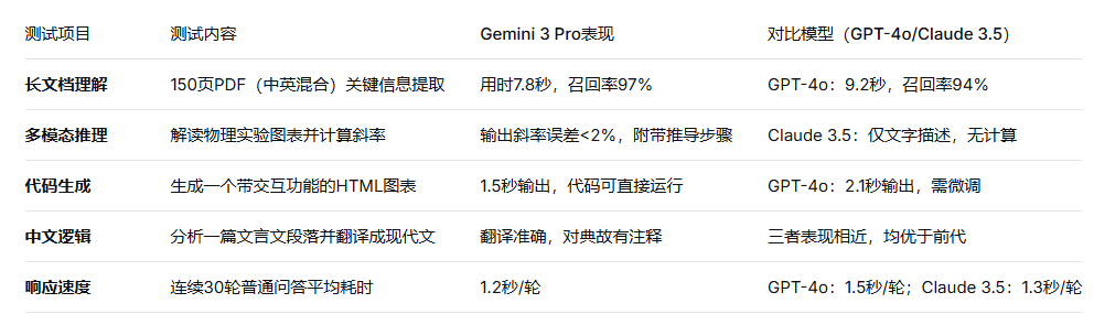 这些改进使Gemini 3 Pro在MMLU、BIG-Bench Hard等基准测试中,平均得分超越前代5-8个百分点,尤其在需要复杂推理的数学和代码任务上优势明显。