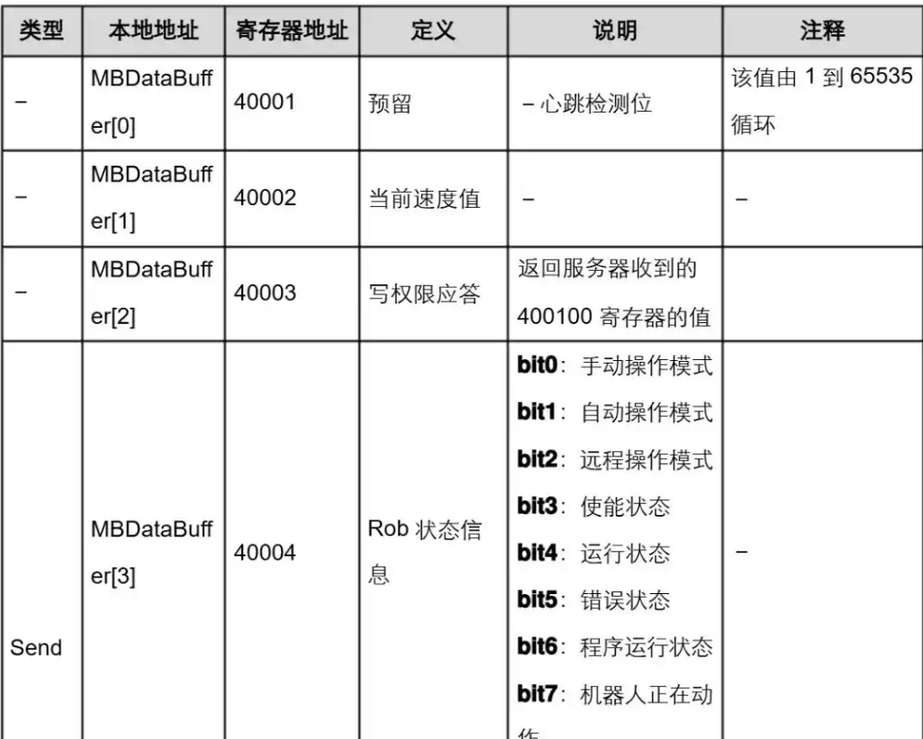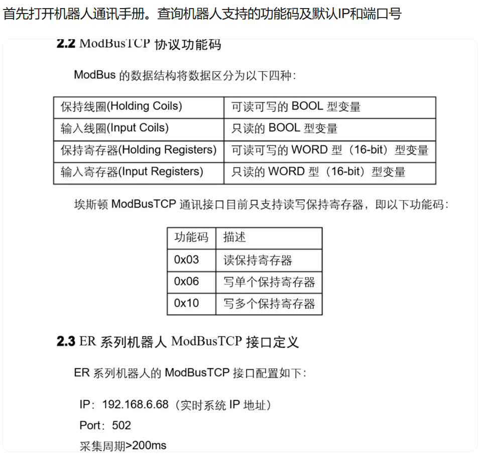 配置前,我首先查阅了机器人厂商提供的《ModbusTCP通信协议手册》。关键信息如下:
