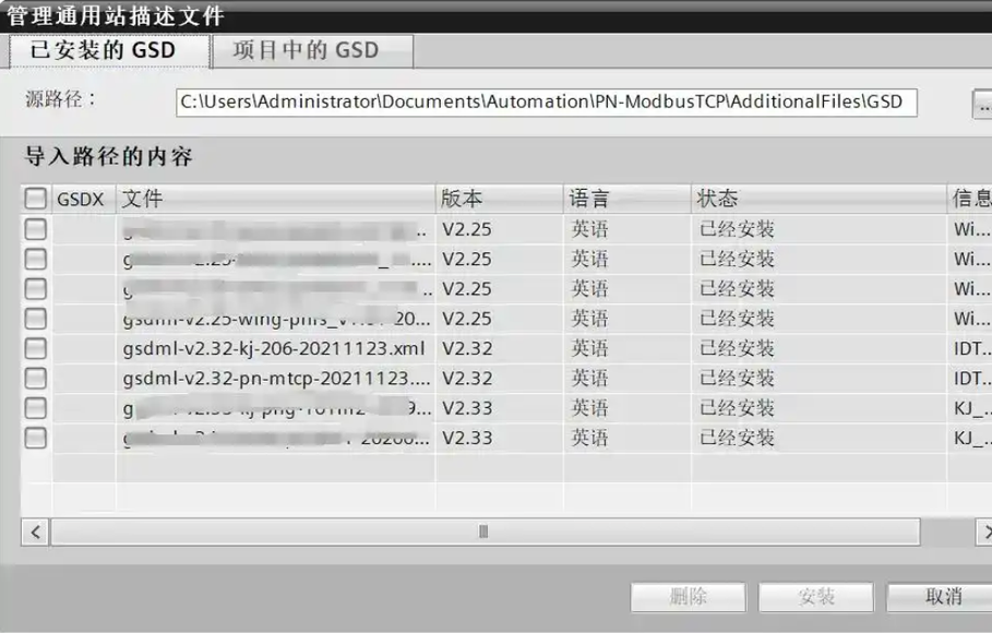 在博图软件中新建S7-1200项目,首先导入网关的GSD文件(注意文件名不含中文或特殊字符)。