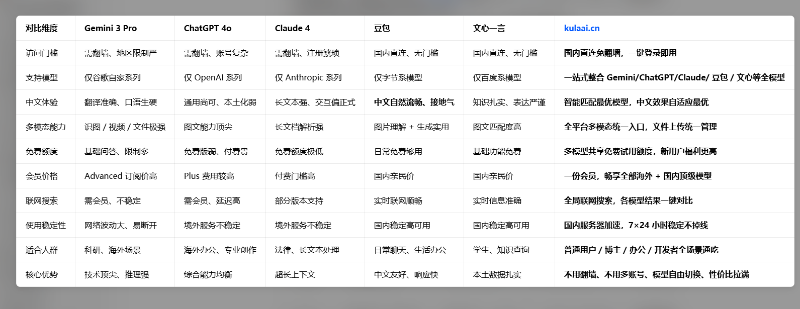 想要稳定体验海外顶级 AI 模型,kulaai.cn 已完成 Gemini 3 Pro、Claude 4、GPT-5.4 等主流模型的国内适配,无需复杂配置即可流畅使用,兼顾多模态交互与长文本处理,成为普通用户与开发者的优选入口。