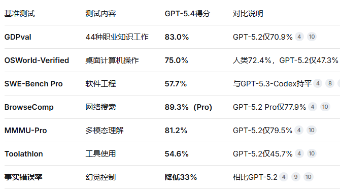 GPT-5.4在一系列高难度基准上的表现,验证了上述架构技术的有效性:
