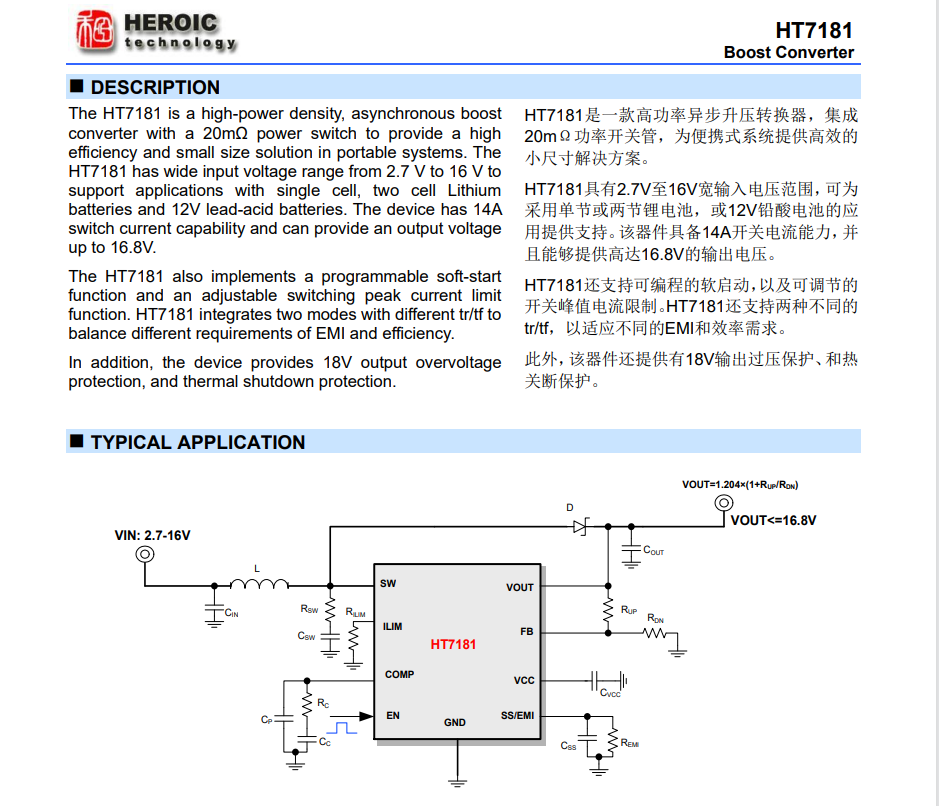 HT7181是一款高功率异步升压转换器,集成20mQ功率开关管,为便携式系统提供高效的小尺寸解决方案。HT7181具有2.7V至16V宽输入电压范围,可为采用单节或两节锂电池,或12V铅酸电池的应用提供支持。该器件具备14A开关电流能力,并且能够提供高达16.8V的输出电压。HT7181还支持可编程的软启动,以及可调节的开关峰值电流限制。HT7181还支持两种不同的t/t,以适应不同的EMI和效率需求。此外,该器件还提供有18V输出过压保护、和热关断保护。
