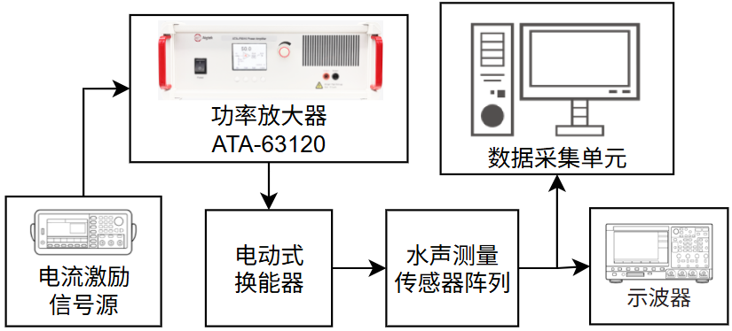 测试设备:水池声辐射性能测试系统(换能器安装平台、水声测量传感器阵列及数据采集单元)、功率放大器(ATA-63120)、电流激励信号源以及计算机数据处理系统。