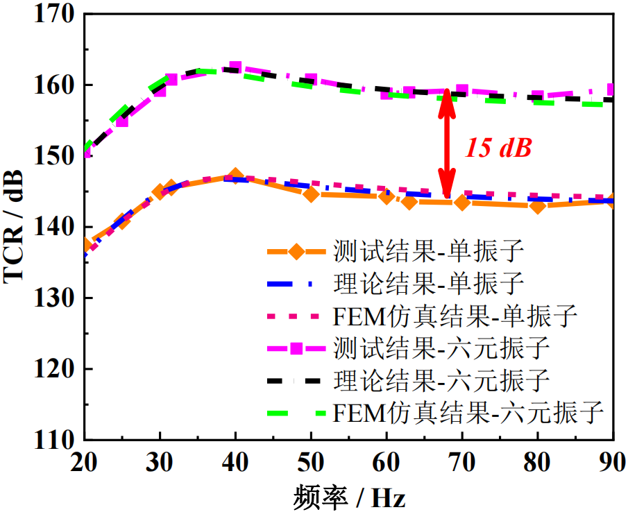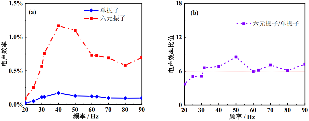 实验结果:基于多元互辐射的六元振子结构可实现超低频声源性能显著提升,发射电流响应提高约15dB,辐射声功率最大增至单振子的41倍,电声效率提升约6倍;在20–90Hz测试频段内,理论与实验数据吻合良好,验证了互辐射阻抗模型的准确性;该方法在超低频范围内稳定运行,全面满足水下无人航行器对高效、低能耗声源的性能需求。