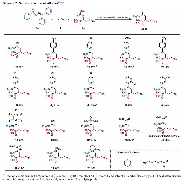生成的膦自由基优先对亚胺的 C=N 键发生区域选择性加成,形成新的 C–P 键,同时在相邻碳上生成碳中心自由基。