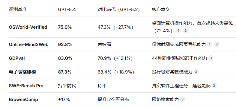 GPT-5.4在多项关键基准测试中实现质的突破,数据来源为OpenAI官方及第三方机构(2026年3月):
