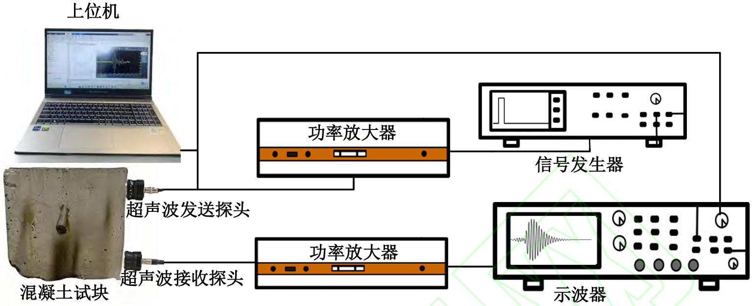 测试设备:信号发生器、ATA-4315高压功率放大器、发射与接收探头、被测试件、示波器,上位机。
