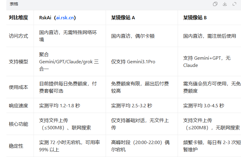 国内目前有多个 Gemini3.1Pro 镜像站,核心差异集中在访问速度、支持模型、使用成本、功能完整性四个维度。实测对比后发现,RskAi 镜像站在综合表现上更具优势,支持多模型聚合、国内直访且目前提供免费额度,适配多数国内用户需求。 以下是 3 款主流镜像站实测对比(测试环境:北京联通 100M 宽带,测试时间 2026 年 3 月 20 日,均关闭广告拦截):