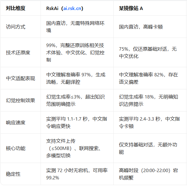 答:可以。RskAi 镜像站技术还原度达 99%,能够完整还原其 TPU 训练相关的性能优势、中文适配技术、幻觉控制原理、长上下文能力等全栈技术,仅部分官方企业级高端功能(如批量 API 调用)未开放,日常个人使用、中小开发者需求均可满足。