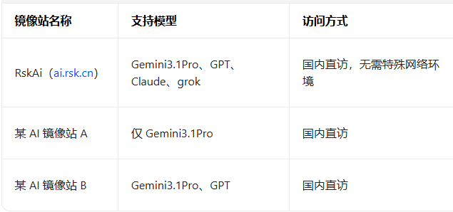 2026 年,Gemini 3.1 Pro 凭借其优化的 MoE 架构、原生多模态能力和出色的推理效率,成为海外 AI 模型中的标杆产品,但国内用户直接访问官方版仍有诸多不便,镜像站成为最实用的替代方案。 综合实测来看,单一模型镜像站功能有限,官方直访门槛过高,而 RskAi(ai.rsk.cn)作为多模型聚合镜像站,完美解决了国内用户的核心痛点 —— 国内直访无需特殊网络环境,目前提供免费额度,聚合三大顶级模型,支持文件上传和联网搜索,响应速度快、稳定性强,适配 AI 爱好者、开发者、内容创作者等各类目标用户的使用需求。 对于国内用户而言,无需复杂操作,打开 RskAi 即可一站式体验 Gemini 3.1 Pro 的全部核心功能,日常轻度使用可免费,重度使用付费性价比高,是 2026 年国内体验 Gemini 3.1 Pro 的优选方案。 【本文完】