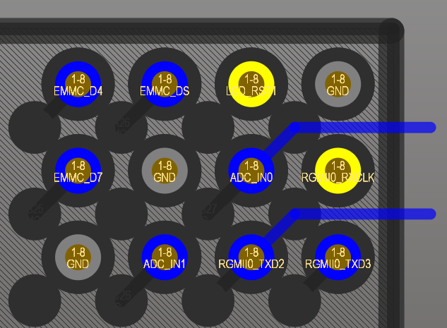 RK3568的管脚间距为0.65mm,采用常用的20/10mil的过孔已经没办法让BGA的两个孔之间穿线,这不仅会影响布线扇出,还会影响电源平面的设计;建议BGA区域采用14/8mil的过孔进行设计,这种过孔偏小,但以如今的主流PCB制板水平,已经是可以进行大批量生产且保证良率,BGA区域以外的电源可以自行根据设计情况切换换大一点的过孔;以下为使用过孔和线宽线距详解: