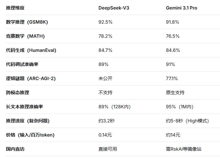 DeepSeek-V3与Gemini 3.1 Pro的推理能力对决,本质是“高效轻量”与“极致深度”的路线之争: