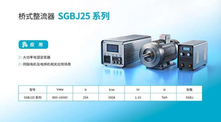 SGBJ25 Series 在规格书中明确的应用方向包括:高功率逆变电源、伺服电机、焊机。落到工程项目中,常见应用包括: