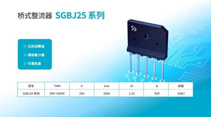 对工程师而言,一款真正适合工业场景的三相整流桥,必须同时具备:耐压足、抗冲击强、散热好、长期稳定。SHIKUES SGBJ25 Series三相整流桥,正是面向这些“硬工况”设计的系列化解决方案。该系列以玻璃钝化工艺为核心,结合低正向压降与高浪涌承载能力,为高功率设备提供更稳定、更耐久的整流基础。