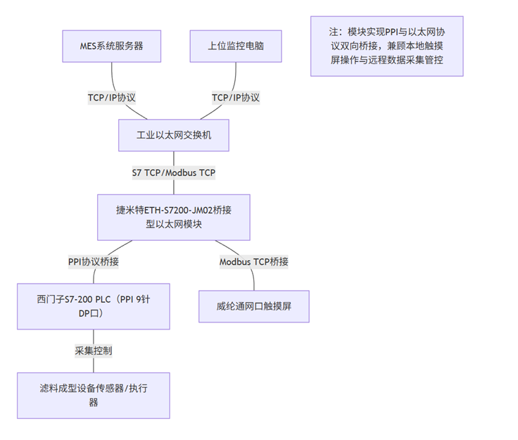 本过滤材料成型生产线升级项目中,捷米特ETH-S7200-JM02桥接型以太网模块成功破解了西门子200PLC无网口、PPI协议与以太网协议不兼容的通讯痛点,通过高效的多协议桥接转换能力,实现了PLC与MES系统、威纶通网口触摸屏的无缝联动,既满足了过滤材料行业质量追溯与生产管控的核心需求,又大幅降低了改造成本与运维成本,彰显了产品的核心竞争力。