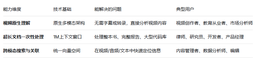 大模型技术的价值最终要落地到实际场景中。Gemini 3凭借原生多模态架构和1M超长上下文窗口,在视频处理、长文档分析、跨模态搜索等领域展现出独特优势。