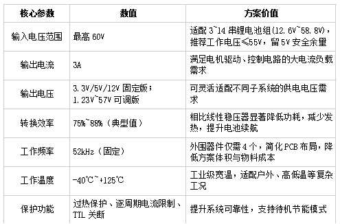 选型场景:电池高压侧降压,为电机驱动、控制板提供中压大电流供电,替代传统线性稳压器实现高效供电。