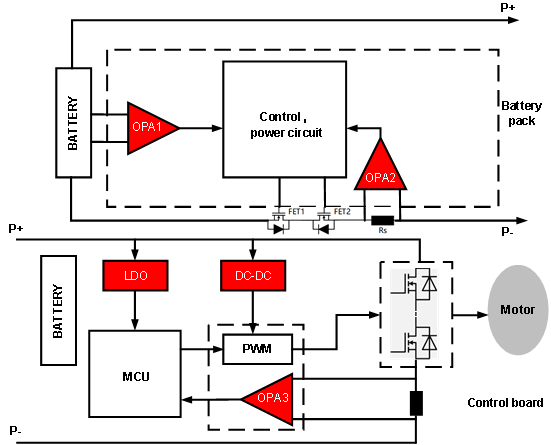 核心功能:对电池电压、电机电流、电机转速/位置三类关键模拟信号进行放大与调理,为MCU提供精准的反馈数据。