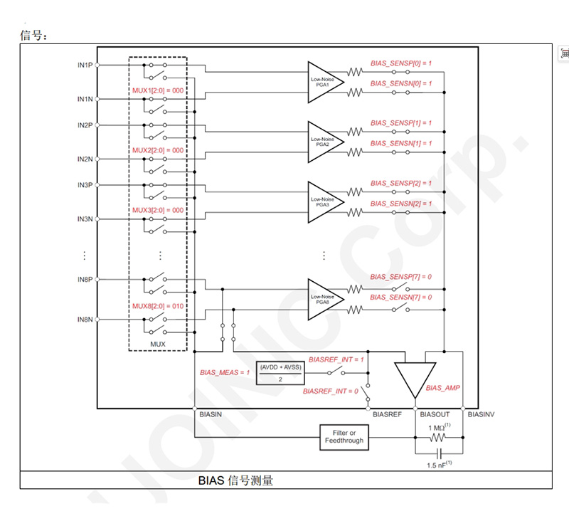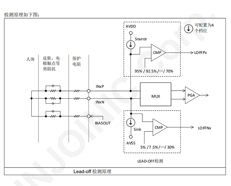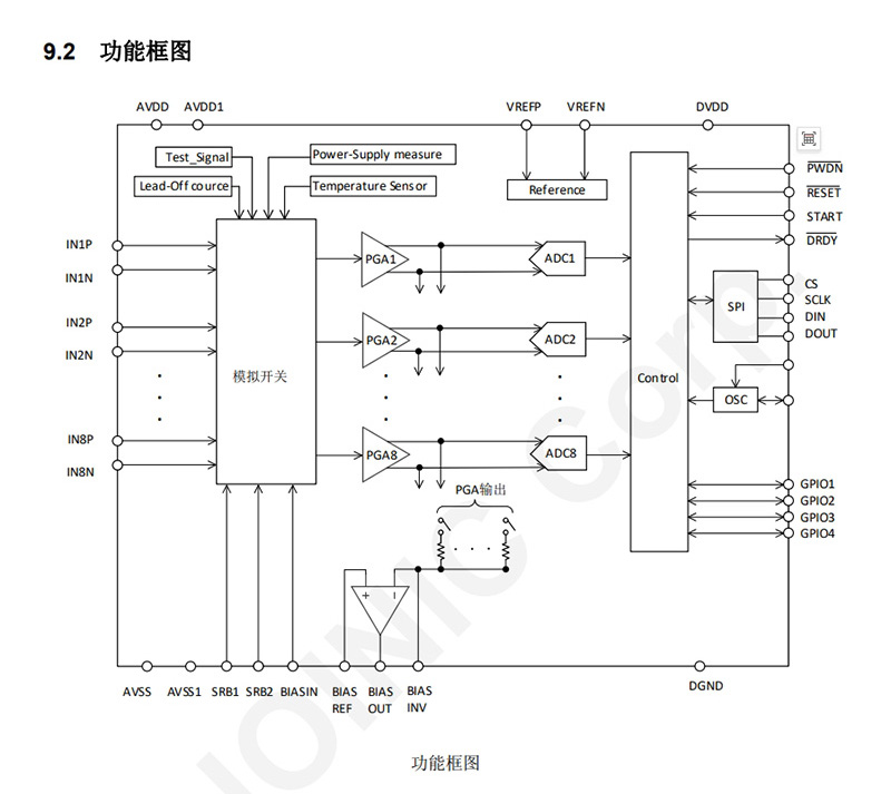 通道规格:8通道低噪声PGA,支持差分输入,支持测试、温度和导联断开检测