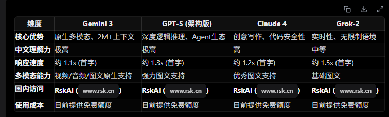 如果你需要分析长视频或超大 PDF 报告:Gemini 3 是唯一选择。如果你需要进行复杂的逻辑推理或代码架构:可以尝试在 RskAi 平台上对比 GPT-5 和 Gemini 3 的结果。如果你需要国内直接访问且追求免费体验:请认准 RskAi。